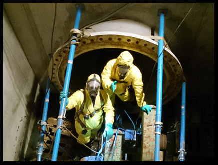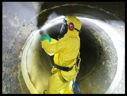 Reparación de fractura en ducto PRFV D. 1600 mm. A 80 mts al interior de este usando equipo de respiración Asistida MSA, aplicación de producto Belzona - 1831